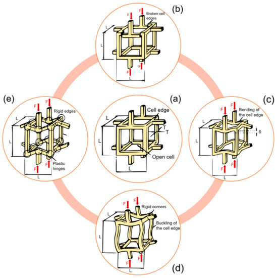 Different meso-scale failure modes of a trabecular network. (a) An unloaded trabecular cell. (b) Brittle crushing. (c) Bending of horizontal rods, compression of vertical rods. (d) Buckling of vertical rods, bending of horizontal rods. (e) Plastic yielding. Readapted from [68].