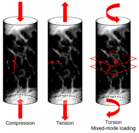 At the meso-scale, trabecular bone microarchitecture influences the damage. Trabecular bone is subjected to a variety of loads during activities of daily life and the orientation of the applied load with respect to the trabecular distribution plays an important role in a possible trabecular tissue degeneration. Indeed, trabeculae generate a three-dimensional, open porous space. Pathologies such as osteoporosis may lead to a conversion from a plate-like to a rod-like trabecular morphology, which contributes to increasing the fracture risk [66]. Typically, trabecular failure initiates at the weakest trabecula or at the weakest trabecular region. From there on, the failure will progress and failure bands will develop. During a tensile test, there will be only one failure band; multiple failure bands, however, occur in compressive tests [67]. Gibson [68] investigated how the basic failure modes (bending, compression, tension, shear) can explain trabecular bone failure (Figure 5). It has been also observed that complete fractures are present in trabeculae that are oriented transversally to the direction of the applied load [69].