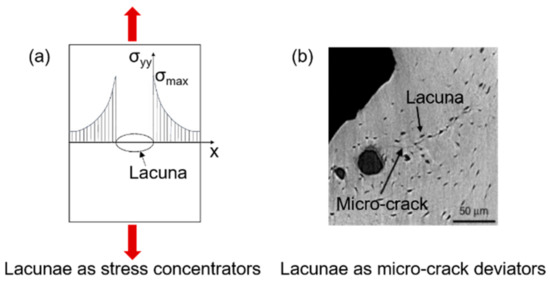 The dual effect of the lacunar system on microdamage: lacunae as sites for crack initiation (a) and lacunae as micro-crack deviators (b); (b) is adapted from [72].