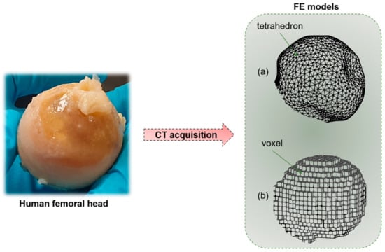 Starting from a human bone (e.g., femoral head), by means of CT acquisition, it is possible to obtain a macro-scale finite element (FE) model of the sample. (a) Geometry-based FE models with tetrahedral elements. (b) Voxel-based FE model with hexahedral elements.