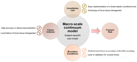 A relevant aspect of macro-scale models is that they can consider an accurate map of the tissue elastic modulus distribution, based on the density distribution over the continuum bone model, as performed by Viceconti [98] and Taddei [101]. These models show low average error in predicting failure load in vitro and have a high precision in identifying the location of failure [98].