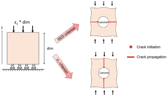 Schematic output of models of a bone sample with a lacuna subjected to compression. Crack initiation (dots) and crack propagation (lines) are highlighted, according to strain energy density (SED) damage criterion and to σ1 criterion.