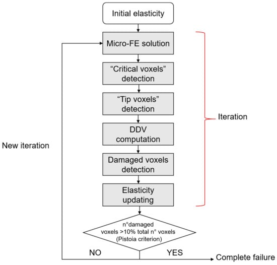 Stress gradient algorithm. “Critical voxels” are the voxels that exceed a defined stress threshold. “Tip voxels” are the center of the spherical sensation region of the osteocytes and are eligible sites for damage propagation. In the stress gradient algorithm, a key role is played by the deletion direction vector (DDV), that indicates a direction for crack propagation. The iteration stops when the total failure of the sample is reached, according to the Pistoia criterion [109].