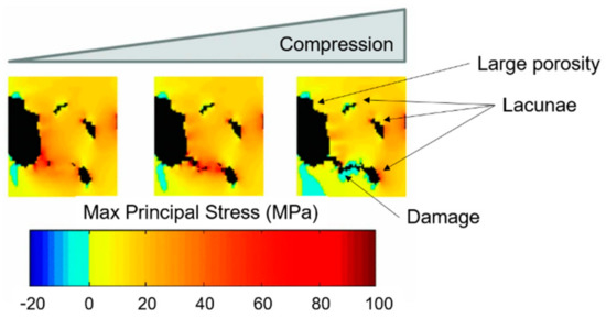 Stress gradient algorithm (on SR CT data from a cortical bone sample) results: damage starts from big porosities and its propagation follows the stress gradient. Micro-damage is deviated by the presence of lacunae. Readapted from [111].
