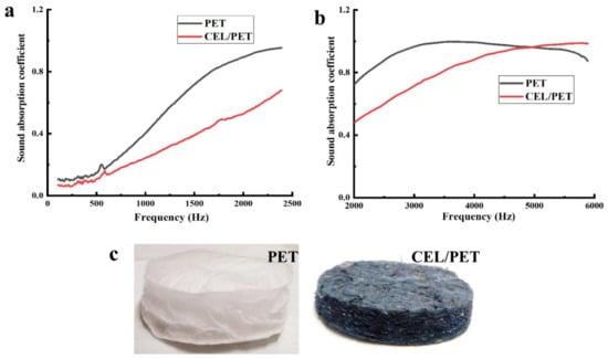 Two commercial insulating materials: (a) sound absorption coefficient in the low-frequency range, (b) sound absorption coefficient in the high-frequency range and (c) digital photos of PET and CEL/PET.