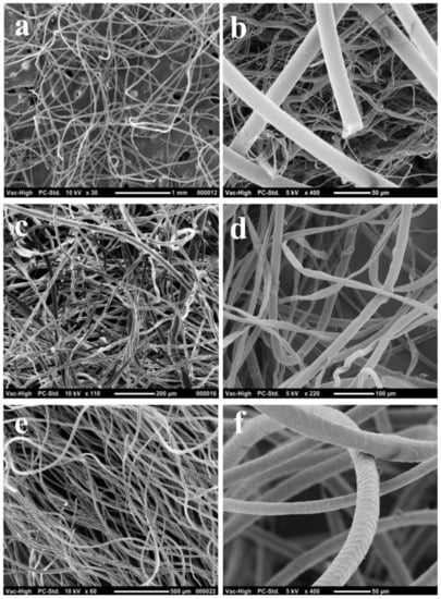 Scanning electron microscopy (SEM) images of fibres in different insulating materials: (a) low magnification of PET fibres, (b) high magnification of PET fibres; (c) low magnification of CEL/PET fibres, (d) high magnification of CEL/PET fibres; (e) low magnification of wool fibres; and (f) high magnification of wool fibres.