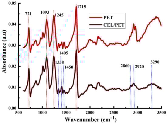 To further investigate the type of fibres used in the commercial samples (PET and CEL/PET), FTIR analysis was carried out and the spectra are shown in Figure 4. Both the PET and CEL/PET possess the identical peaks at 721, 1093, 1245, and 1715 cm−1, which represents C–H aromatic ring wagging, C–O stretching, ester C–O stretching, and C=O stretching, respectively those are directly expressing the presence of Polyethylene terephthalate (polyester) in their chemical structure [34,35]. Besides, the peaks positioned at 2900 and 3400 cm−1 are representing the vibration of the C–H stretching and O–H stretching, respectively, might be representing the existence of PET [36,37]. On the other hand, the CEL/PET insulating material showed specific peaks at 1338 cm−1 (–CH bending), 1405 and 1450 cm−1 (–OH bending), 2860 and 2920 cm−1 (–CH stretching), and 3290 cm−1 (stretching of –OH groups) those are related to the fibres with cellulosic structure [34,35] and more specifically cotton fibres (as confirmed by SEM). Therefore, from both the SEM and FTIR analysis, it can be claimed that the commercial insulating materials, PET and CEL/PET, were composed of polyester fibres and a blend of cotton/polyester fibres, respectively.