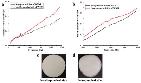 The WNM was fabricated by the needle-punching mechanism that created two different surface structures on either side of the WNM. The needle-punched side showed a compact plain and porous surface (Figure 5c), whereas the non-punched side with a loose rough fibre surface (Figure 5d). Figure 5a,b demonstrated the sound absorption coefficient of the WNM measured on two sides in the low and high-frequency range, respectively. The needle-punched side showed a higher sound absorption coefficient in all the frequencies ranged between 108 and 5889 Hz. In addition, this side of the WNM showed higher NRC (0.29) compared to the non-punched side (0.17). The higher sound absorption coefficient and NRC of the needle-punched side could be attributed to the compact but porous surface of this side. It is likely that when the sound wave strikes a relatively porous surface, a lower proportion of the sound will be reflected compared to the more open surface [40]. The reason might be due to the fact that the porous surface allows many internal reflections, resulting in more absorption and less reflection [40,41]. Shahani et al. [41] investigated three different surface acoustic properties of needle-punched nonwoven fabrics and found the plain surface showed the highest NRC rather than the velour and cord surfaces due to its compact structure, porosity, and fibrous assembly. Therefore, in further investigations of the WNM, the plain surface of the needle-punched WNM was fitted to face the Impedance Tube sound source in the following sections.