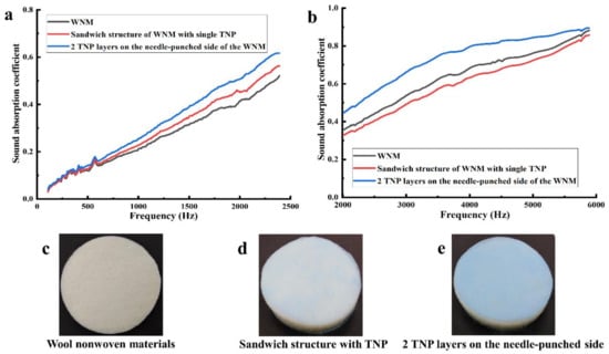 Properties of the wool nonwoven materials with and without thin nonwoven polyester (TNP): (a) sound absorption coefficient in the low-frequency range, (b) sound absorption coefficient in the high-frequency range (c) wool nonwoven materials, (d) sandwich structure of the WNM with single layer TNP, and (e) two TNP layers on the needle-punched side of the WNM.