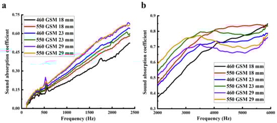 The effect of thickness on the acoustic properties of the WNM was investigated by fabricating a range of WNM with different thicknesses ranging from 18 to 29 mm, which were needle-punched into two different area densities of 460 and 550 GSM. The sound absorption coefficient of the fabricated WNM was evaluated in both low (Figure 7a) and high-frequency ranges (Figure 7b). As shown in Figure 7a, at the low-frequency area and for both area densities of 460 and 550 GSM, the wool nonwoven materials (WNMs) with the higher thickness resulted in better sound absorption coefficient compared with the lower thickness. However, the differences between the thicker and thinner WNM in the sound absorption coefficient at the high-frequency range (2002–5889 Hz, Figure 7b) was not as significant as its effect on the sound absorption coefficient within the low-frequency range. For the WNM of 460 GSM in the range of 2002–3500 Hz, the WNM with the greater thickness contributed to the higher sound absorption coefficient. However, after 3500 Hz, the WNM with lower thickness induced a higher sound absorption coefficient. A similar trend was evident on the WNM with an area density of 550 GSM. Therefore, it can be concluded that thickness has a direct relationship with sound absorption at lower frequencies but insignificant influence at higher frequencies [44]. Thus, WNM can be used in different thickness range based on the sound insulating requirements of different parts of the automobile for different frequency ranges.