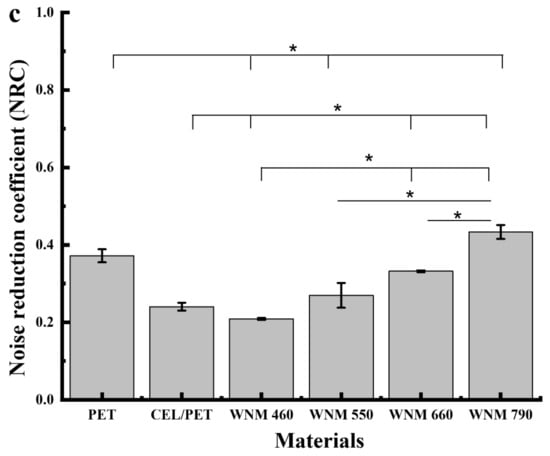 Sound insulating properties of the WNMs with different area density and commercial materials (PET and CEL/PET): (a) sound absorption coefficient of all the materials in the low-frequency range, (b) sound absorption coefficient of all the materials in the high-frequency range, and (c) noise reduction coefficient (NRC) of all the materials. Error bars show the standard deviations—statistical significance: p < 0.05 (*).