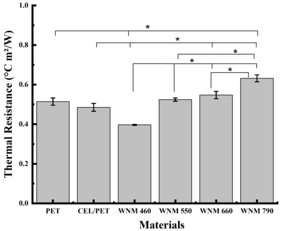 Thermal resistance of the commercial insulating materials (PET and CEL/PET) and the wool nonwoven materials (WNMs) with different area density. Error bars show the standard deviations—statistical significance: p < 0.05 (*).