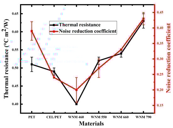 Figure 10 shows the relationship between the thermal resistance and the noise reduction coefficient of the commercial insulating materials and the WNM. Thermal resistance and noise reduction coefficient showed a relatively similar pattern towards each sample, which means for individual fibre type these two insulating properties are dependent on similar parameters such as fibre diameter, thickness, and area density [48,53].