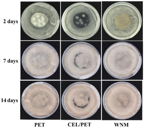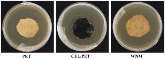 Antifungal properties of PET, CEL/PET, and WNM were assessed according to the AATCC TM030-2017. All the samples were cut into 3 cm diameter discs. Potato Dextrose Agar (Sigma-Aldrich, Sydney, Australia) was used as the test media. Penicillium varians (also known as Penicillium funiculosum, ATCC 10509) with a spore population of 1.0 × 106 CFU/mL were used as inoculum and were distributed (0.5 ± 0.1 mL) evenly over the surface of the agar. Pre-wet specimens were autoclaved (The Chipmunk, Atherton, Australia) and placed on the agar surface. The inoculum (0.2 ± 0.01 mL) was evenly distributed over each disc using a sterile pipette (Interpath, Heidelberg West, Australia). Penicillium varians growth on these three different materials was observed after 2, 7, and 14 days of culture at a temperature of 28 ± 1 °C.