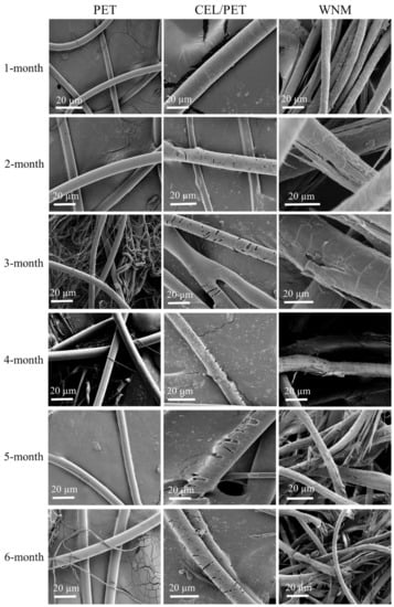 To evaluate if the materials used in this study would qualify for Reuse-Recycle and Reuse-Recover at the end-of-life vehicles, the biodegradability of commercially insulating materials and the fabricated WNM samples was tested. The soil biodegradation of the PET, CEL/PET, and wool nonwoven materials (WNMs) was evaluated based on their weight loss (%) [31]. Figure 13 demonstrates the SEM images of the PET, CEL/PET, and WNMs during six months of evaluation. Figure 14 shows the trend of weight loss (%) for six months. The biodegradability of the natural fibres is higher than most of the synthetic fibres [31]. Similar behaviour was found for the PET, CEL/PET, and WNMs. As the PET was composed of purely synthetic materials (polyester as shown by FTIR spectra), its degradation rate was very low and negligible (~7%). On the other hand, both the CEL/PET and the WNMs showed more than 50% soil degradation in the period of six month. Though it was expected that, due to the presence of polyester, weight loss (%) of the CEL/PET was lower that WNM, it was marginally higher than that of the WNMs (Figure 14), which might be due to the presence of cotton fibre in CEL/PET.