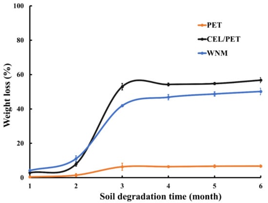Month-wise weight loss (%) of the PET, CEL/PET, and WNM.