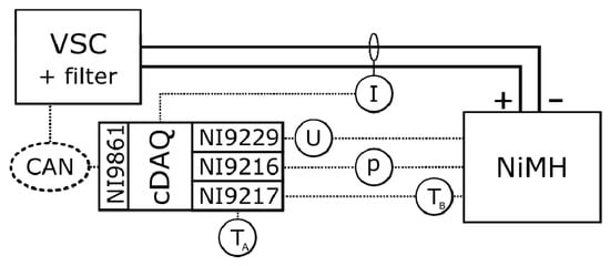A cDAQ data acquisition system exchanges data with the computer during the experiment via USB. Four acquisition cards were mounted into the rack: a NI9861 for the controller area network (CAN) protocol communication with the VSC, a NI9229 (±0.3% gain error) and a NI9216 (±0.2 °C error for temperature measurements, voltage error not given) for measuring the voltage of the NiMH battery and the gas pressure sensor, respectively, and a NI9217 (±0.2 °C error) for measuring the ambient and battery temperature. A picture of the experimental setup is shown in