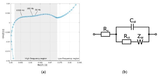 23], where the chemical reactions and mass transport properties of the battery are represented by a capacitance connected in parallel to a resistance and a Warburg element—a representation of the electrochemical mass transport—in series. This parallel circuit is then combined with a resistance in series representing the ohmic resistance,