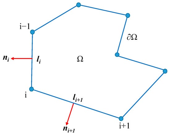 Using the integration by parts, the areal integrals in Equation (32) can easily be converted to the boundary integrals, and then, it can be computed precisely because u = (u, v) is linear on each edge of Ω. Denoting the length of edge i connecting vertex i−1 and vertex i as li, as Figure 4 shows, and the outward unit normal vector on edge i as ni = (nix, niy)T, ⟨∇u⟩ can be computed as