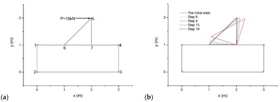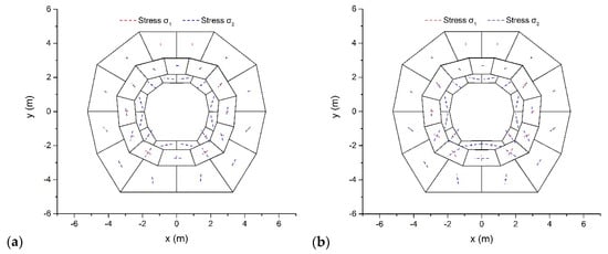 Using δ = 0.005 and a self-adjusting Δ from the code, the proposed method was employed to conduct a static analysis of the problem. Taking the friction angle φ = 30° for the joints between blocks, Figure 10a illustrates the ultimate configurations and main stresses after 100 time steps. The proposed method arrived at the conclusion that the model is stable. The stress level decreases from the outer layer to the inner layer. At the top and the bottom, the inner layer suffers the largest horizontal compress effect. The top two rocks in the inner layer suffer σ1 = −0.4 kPa and σ2 = −109.7 kPa, which induces a minimum principal stress direction of 6.7°. The bottom two rocks in the inner layer suffer σ1 = −15.6 kPa and σ2 = −138.6 kPa, and the direction of the minimum principal stress is 11.4°.