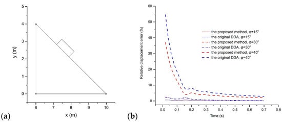To appraise the accuracy of the new method, three values, 15°, 30°, and 40°, were assigned to the friction angle. Taking Δ = 0.02s and δ = 0.10, 35 time steps were computed. Referring to the analytical solutions of Equation (72), the relative errors of the proposed approach and the original DDA results were measured and are drawn in Figure 7b.