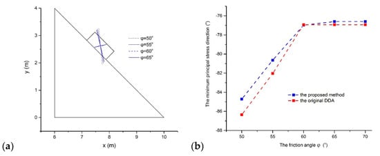 As in the original DDA, the constant stress is estimated using the proposed method because only the constant strain associated with ΠPu can be determined within the block. To investigate the difference in stress results of DDA with the post-adjustment strategy and the proposed method, the sliding problem was reanalyzed. Because the stress is unstable in a dynamic analysis, five friction angles, 50°, 55°, 60°, 65°, and 70° were adopted and static analysis with 50 time steps was executed to obtain a stable stress result. Firstly, little difference occurs in the resulting stress values of the two methods. When φ = 50°, the maximal principal stress σ1 = 0.50 kPa and the minor principal stress σ2 = −6.91 kPa in the original DDA and σ1 = 0.63 kPa and σ2 = −6.66 kPa in the proposed method. When φ = 70°, σ1 = 2.22 kPa and σ2 = −5.97 kPa in the original DDA and σ1 = 2.22 kPa and σ2 = −5.91 kPa in the proposed method. Then, the minimum principal stress direction appears to increase gently with the friction angle increasing, as shown in Figure 8a, and it stabilizes when the friction angle increases to 65°. The variations in the minimum principal stress direction with the friction angles are plotted for the two methods in Figure 8b. The proposed method has a gentler direction for the minimum principal stress. The stable direction for the minimum principal stress is −76.93° in the original DDA and −76.60° in the proposed method.