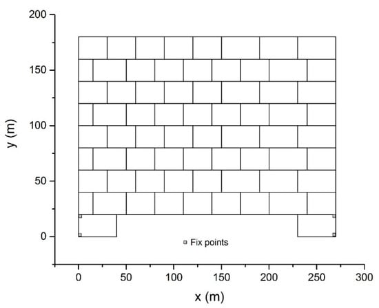 As Figure 11 shows, a wall containing 70 blocks was analyzed to test the capacity of the proposed method. The wall had a width of 270 m and a height of 180 m. The mechanical parameters of the blocks were given as ρ = 2.0 × 103 kg/m3, E = 500 MPa, and ν = 0.25. The external load only included the gravitational force with g = 10 m/s2. No friction occurred between the blocks. The outer vertices of two base blocks were fixed as the boundary conditions.