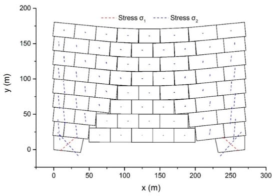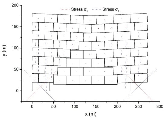 With Δ and δ unchanged, the dynamic behavior of the example was reanalyzed using DDA with the post-adjustment strategy. The configurations and main stress vectors after 7 s elapsed are shown in Figure 13.
