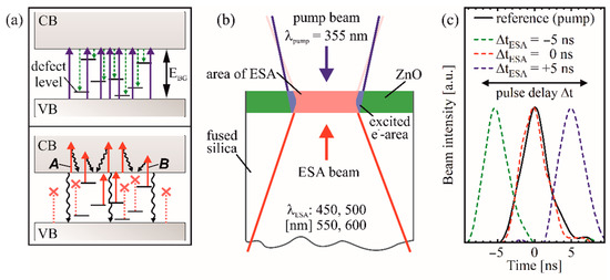 The sinusoidal interference fringes in the spectrum are caused by reflection losses due to interference effects of the radiation between the air–film and film–substrate interfaces [33]. This indicates homogeneous, smooth, and low scattering surfaces [34]. Thus, only at sufficiently high beam fluences, an independent ESA beam ablation is expected by either a multi-photon absorption or processes including various intrinsic point defects. The latter include deep level defects inside the ZnO layer or shallow donors that are located typically at the surface [20,22,35,36]. As illustrated in Figure 2c, the location of the intrinsic defect levels were calculated by Xu et al. with a full-potential linear Muffin-tin orbital method [32]. These include vacant zinc (VZn), vacant oxygen (VO), interstitial zinc (Zni), interstitial oxygen (Oi), substituted oxygen at zinc positions (OZn), and complexes of V0 and Zni (V0Zni).