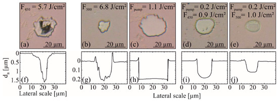 Figure 4a,b show selected single-beam ablation spots for the utilized ESA wavelengths. At high FESA, the absorption of defect levels at the fused silica–ZnO interface leads to substrate damage (Figure 4a,f). At FESA close to Fth, the ablation spots become increasingly inhomogeneous (Figure 4b). As described earlier, the further decrease of FESA results in only partially interconnected spots inside the beam. In comparison, the pump beam hits the ZnO–air interface first (Figure 1b) and the fundamental absorption leads to an almost circular and homogeneous single-beam ablation of the entire ZnO layer (Figure 4c). When reaching the ZnO–substrate interface, the pump beam is already highly attenuated preventing abrupt heating and damaging of the substrate (Figure 4h). The maximum da observed in the depth profiles (Figure 4g–j) are in good agreement with the calculated layer thickness dL = 203 nm.