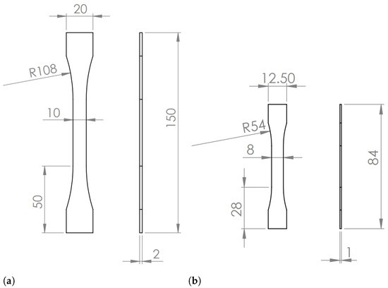 Standard “dogbone” specimens follow the British standard BS 2782 [37] (Figure 1a). The reduced-scale “dogbone” specimens have the dimensions shown in Figure 1b and have been used in previous studies [38,39].
