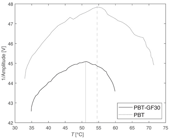 It can be observed that both the PBT and the PBT-GF30 display a disturbance in the curve slightly above 50 °C, which corresponds to , and only display significant degradation for temperatures above 200 °C, with a peak slightly above 220 °C, which corresponds to the melting temperature of the material. Therefore, in the range of temperatures analyzed, the chemical degradation is not significant. Similar results for DSC were found by Ma et al. [45] and Souilem et al. [46] for fiber-free PBT.