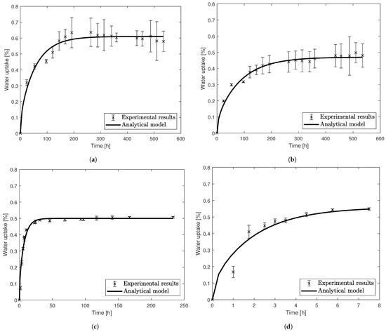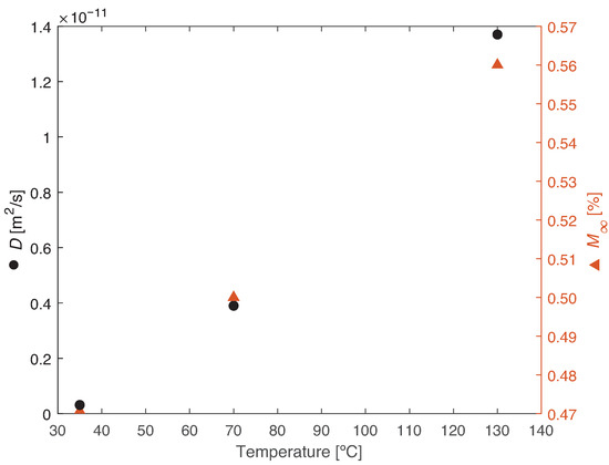 where t represents time starting from the immersion and h represents the thickness of the specimen. Therefore, a script was run in Matlab to determine the best fit of the coefficient of diffusion, D, and infinite water uptake, . For that, the least square method was used. The values determined for each material and each temperature, T, are given in Table 2.
