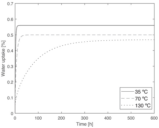 where is the mass of the specimen at the current time step and is the initial mass of the specimen. This process was repeated for 35, 70, and 130 °C. For 130 °C a water container was kept open inside the climatic chamber, and small amounts of water were periodically added. The specimens were considered to be saturated when the water content was stable, showing that the material was unable to absorb more water. For each condition, at least four specimens were tested.