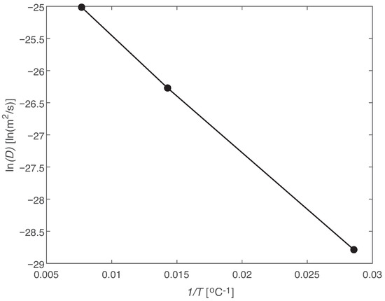 Therefore, if D as a function of T follows an Arrhenius relation, and will have a linear relation, Figure 7. From these results, as a function of temperature is given by a linear relation with a coefficient of determination, , of 0.9985. The coefficient of determination of the linear relation between and is 0.9996.