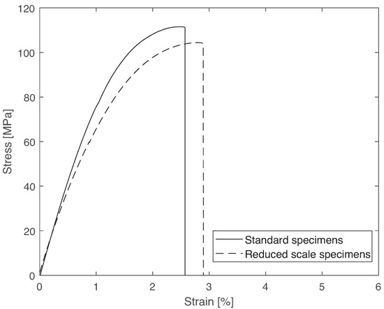 The representative stress vs. strain curves for standard and reduced-scale “dogbone” specimens can be observed in Figure 8, and the results are shown in Table 3.