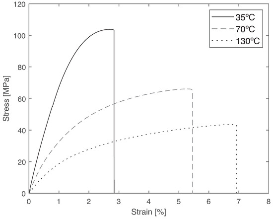 Representative stress–strain curves for the three temperatures analyzed are given in Figure 9, and the results are shown in Table 4.