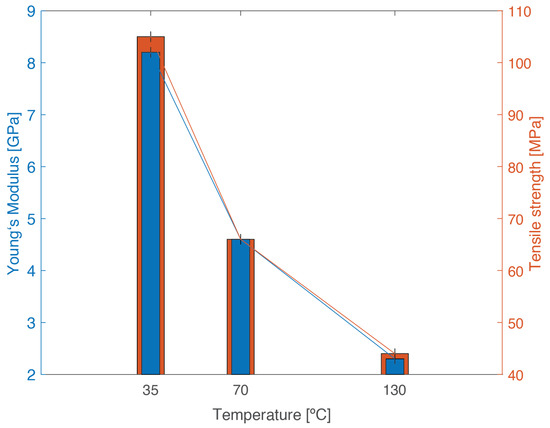 It can be concluded that the reduced-scale specimens can be used to characterize the material as a function of temperature and immersion time. However, it is important to understand that the results obtained from standard specimens and reduced-scale specimens are not exactly the same. In previous studies [38] using the same specimens, strength increased compared to the standard “dogbone” specimens. Additionally, it was stated that the differences in Young’s modulus and strength were greater for more brittle materials. In this study, the difference in Young’s modulus and strength for the stronger and more ductile material were about 9 and 8%, respectively, and, for the more flexible and less ductile material, about 45 and 23%, respectively. In the present work, the error was of 5 and 6% for Young’s modulus and strength, respectively, which is lower that what was recorded for the previous work.