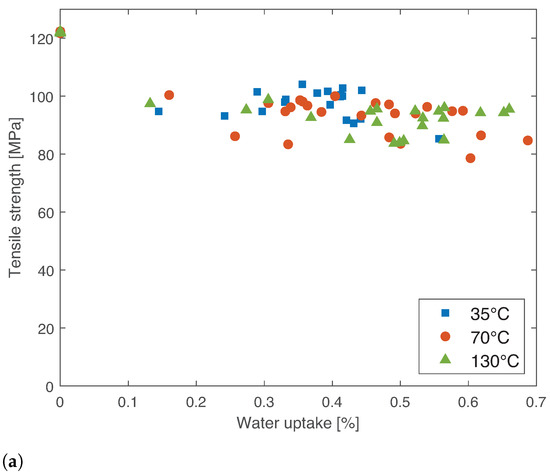 Regarding the mechanical properties, moisture degradation is generally responsible for a decrease in the strength and stiffness of thermoplastic materials. This process also contributes to a higher ductility of the polymer, verified by an increase in strain at failure, especially for temperatures above when the motion of the polymer’s molecular chain increases [13,18,19].