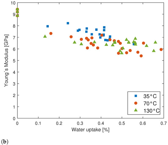 The other variable that may influence the results is temperature. Although it is common for tests to be performed at room temperature after water immersion at a higher temperature, the specimens used in the present study have a smaller thickness to decrease immersion time, which may lead to a quicker decrease in temperature between the time the specimen is removed from the climatic chamber and the end of the test. Therefore, temperature plays a less significant role, leading to a higher strength and Young’s modulus.