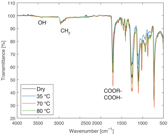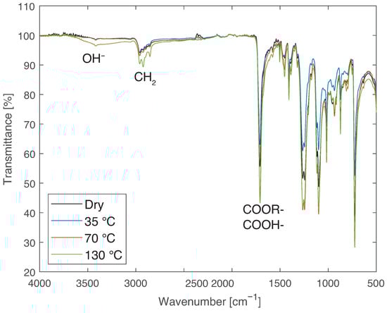 The analysis of the FTIR spectra of dry samples and samples saturated at 35, 70, and 130 °C allows one to determine the extension of the effects of moisture aging, since if chemical relations are established between the PBT-GF30 and irreversible damage that occurs in the material, the intensity of the absorption bands for relevant groups changes. The specimens were simulated numerically and kept in water for a sufficient amount of time to reach saturation. The FTIR analysis was carried out using a PerkinElmer Spectrum Two machine (Waltham, MA, USA). Wave lengths of 4000–500 cm were used at a scanning velocity of 0.2 cm. These tests were performed with a LiTaO detector (15,700–370 cm) and a KBr window. The spectra were obtained in attenuated total reflectance (ATR), which creates spectra equivalent to transmittance. Bulk specimens with a thickness of 1 mm were used. To narrow the range of temperatures at which changes in the FTIR profile occur in the material, other temperatures were, afterwards, analyzed. Three specimens were tested.