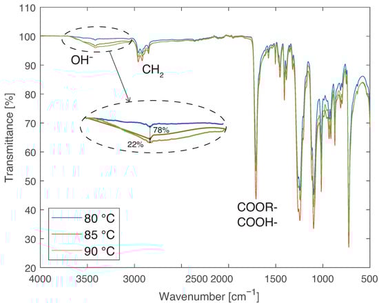 Regarding chemical degradation of the material, after water immersion at a temperature between 80 and 85 °C, there is the establishment of chemical connections between water and PBT or hydrolysis of PBT (degradation of the polymer chain), which produces alcohol and carboxylic groups, both exhibiting OH groups.