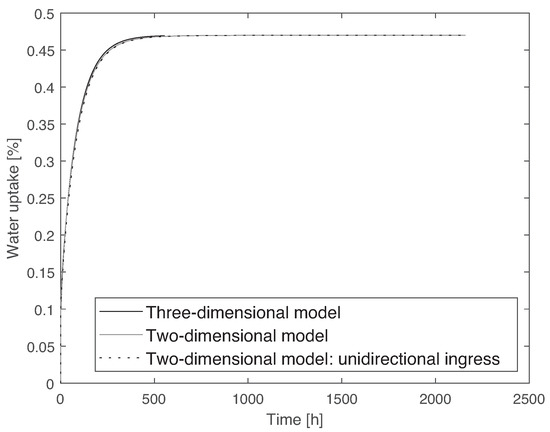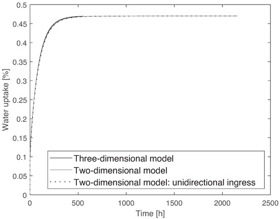 Comparison between the three-dimensional, two-dimensional, and two-dimensional with unidirectional ingress models for a plate with a 30 mm side length, using data from PBT-GF30 at 35 °C. As can be observed, the two-dimensional model remains valid.