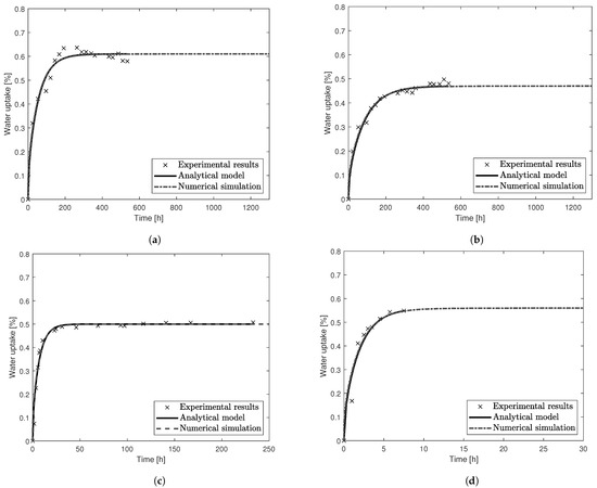 Numerical simulation of water uptake for the gravimetric tests compared with the analytical model and experimental results, showing that the simulation fits the analytical model. (a) PBT at 35 °C. (b) PBT-GF30 at 35 °C. (c) PBT-GF30 at 70 °C. (d) PBT-GF30 at 130 °C.