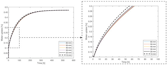 Numerical simulation of the water uptake of specimens with different sizes at 35 °C, showing that the results are in agreement for the 60 and 30 mm side lengths.