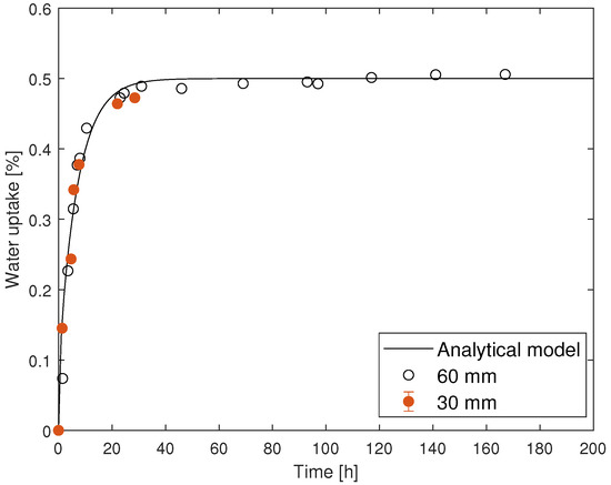 °C to avoid the long immersion time required to saturate the material at 35 °C and to avoid chemical changes that would occur at 130 °C. Figure 20 shows that the water uptake behavior obtained with plates with a 30 mm side length have similar experimental results to those with a 60 mm side length.