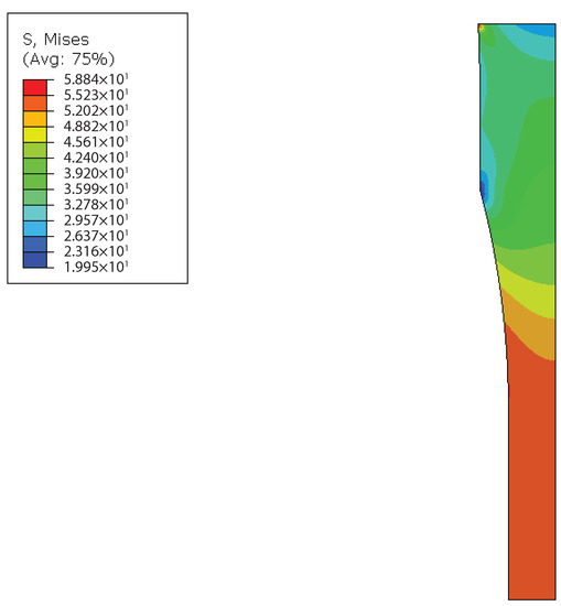 The bulk tensile tests at room temperature using the reduced-scale specimens were simulated in Abaqus using one-eighth of the specimen, taking full advantage of symmetry. One of the edges was pinned, and displacement was applied to the opposite side. In this model, a uniform mesh of 0.2 mm was used, and both the elastic and plastic properties of the material were considered. The mesh and stress in the time increment before plasticization starts can be observed in Figure 21. The elements used are 3D stress, an 8-node linear brick, and reduced integration (C3D8R). This simulation was conducted from the properties obtained in the as-supplied state when tested at room temperature as a given condition to evaluate stress distribution for bulk tensile tests.