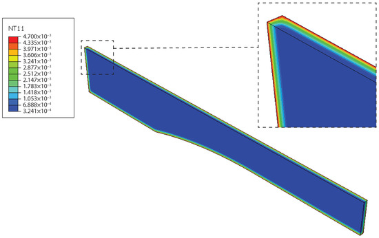 Reduced-scale specimens were also simulated in Abaqus. Taking advantage of symmetry, only one-eighth of the specimen was represented. Additionally, the same boundary conditions described above for the gravimetric analysis simulation were used. In Figure 22, water distribution was achieved after one day and a half of water immersion at 35 °C. The global water uptake level at this point in the specimen was 0.26% according to the numerical simulation.