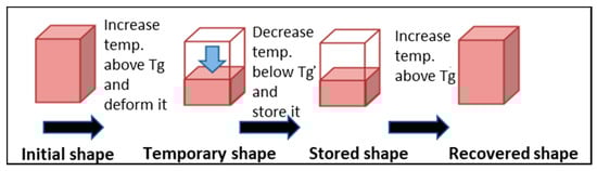 Shape memory effect (SME) is the phenomenon whereby the original shape of a material is recovered in the presence of a suitable stimulus such as heat, light, electric, or magnetic fields [1]. This has been observed in many different materials, including metallic alloys and polymers [2]. SME consists of two different processes, as shown in Figure 1: Programming process in which the material is deformed into a temporary shape, and the recovery process during which the material recovers its original shape.