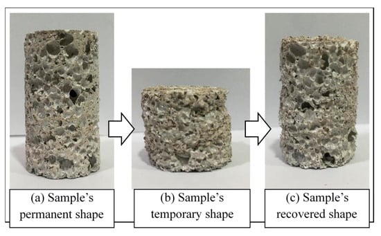 Three replicas were prepared and tested to study the shape memory effect. The same technique as above was followed in order to obtain the foamed samples. All the foamed samples prepared, from each set of experiments, were placed in an oven previously heated to 120 °C. They were kept at that temperature for two minutes to soften their structure and make it easier to compress them. Subsequently, these samples were compressed using a scaled plunger for one minute at room temperature in an air environment to reach 50% of their original height. Samples were placed in a cylindrical mold in order to direct the motion downwards during compression. Furthermore, they were allowed to cool down to receive their temporary shape. After that, the compressed samples were placed in the oven once again to allow the shape recovery process to take place. The samples were removed once they had returned to their original height, with a high recovery ratio of 100%. See Figure 5 below.